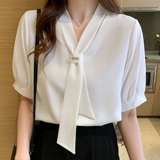 Tie neck chiffon blouse clearance, Hanji Short-Sleeve Tie-Neck Chiffon clearance