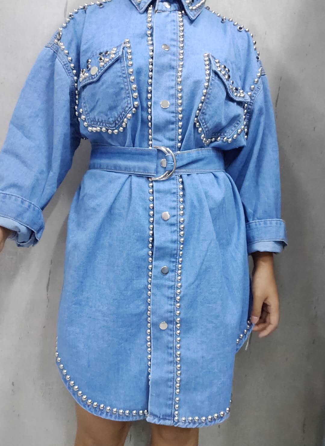- Solid rivets long sleeve denim dresses sold