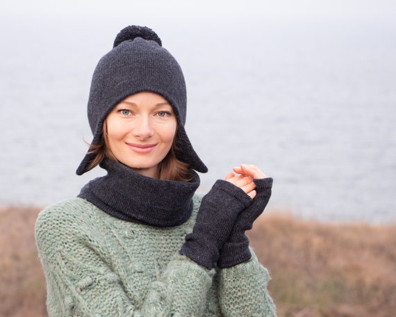Womens beanie with ear flaps clearance, Women ear flap hat scarf gloves set clearance