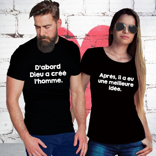 Tee shirt humour couple clearance, Dabord dieu crea l'homme – Tshirt Duo pour Couple clearance