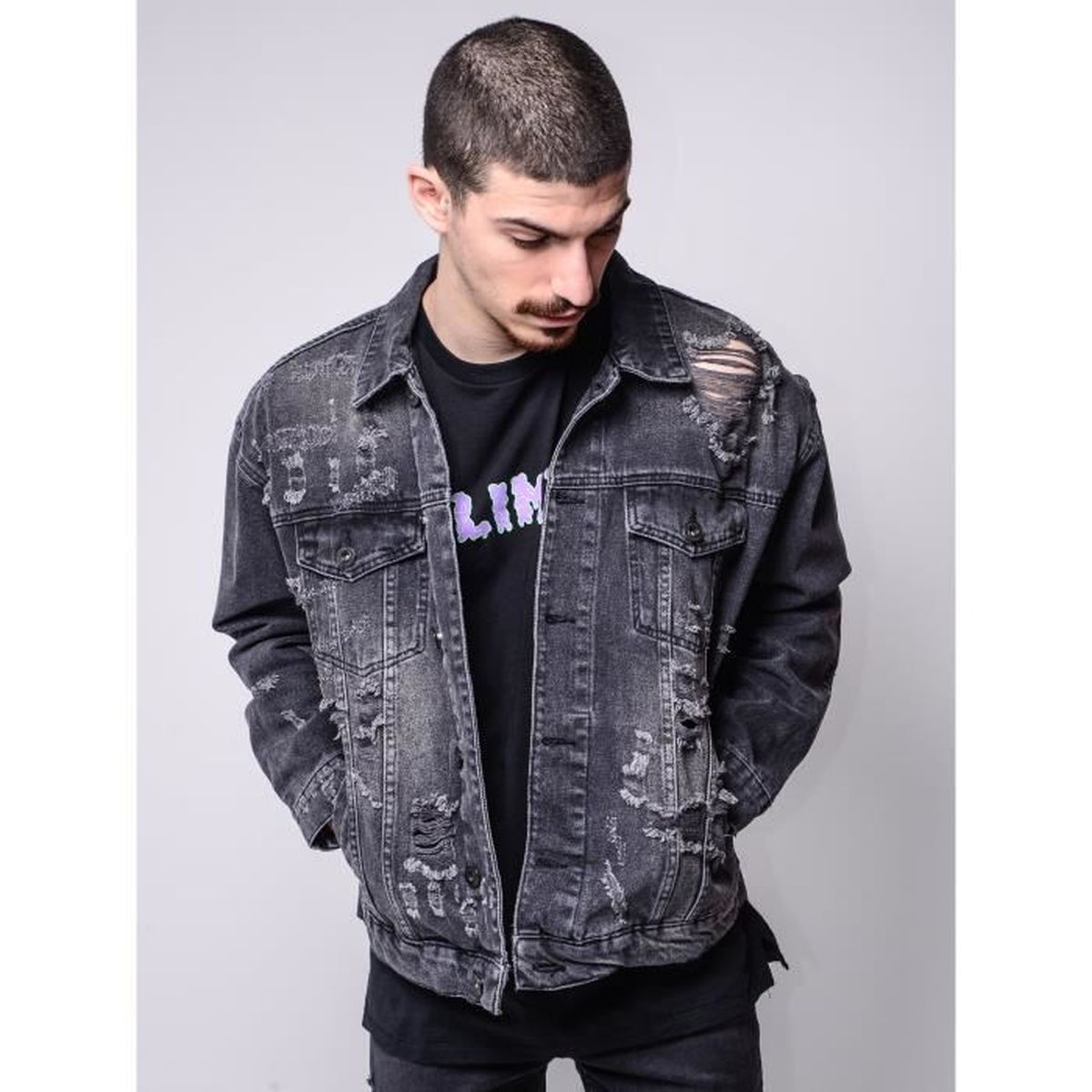 - Shopping Veste en jean noir délavé homme