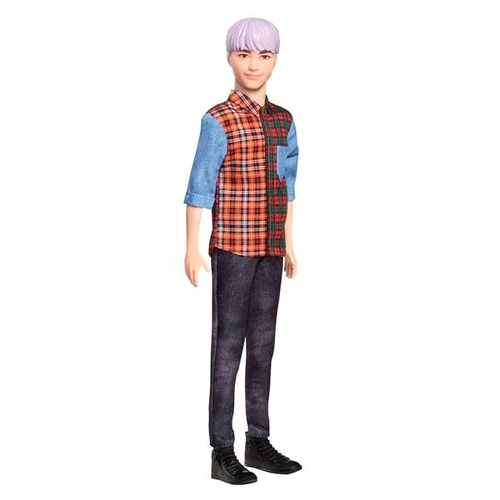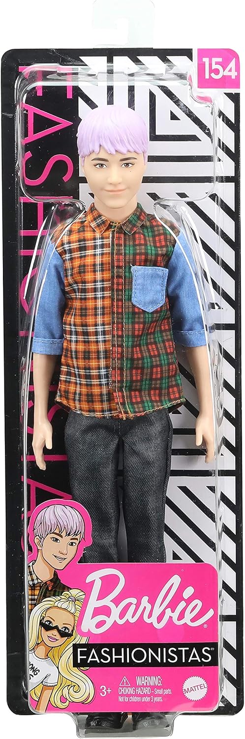 Ken fashionista 154 clearance, Barbie Ken Fashionistas Doll 154 with Sculpted Purple Hair Wearing a Color-Blocked Plaid Shirt, Black Denim Pants \u0026 Boots - B`n Doll`s Planet clearance