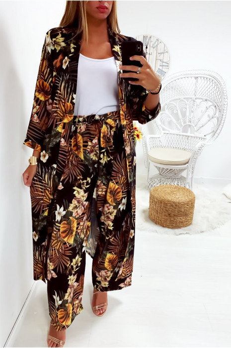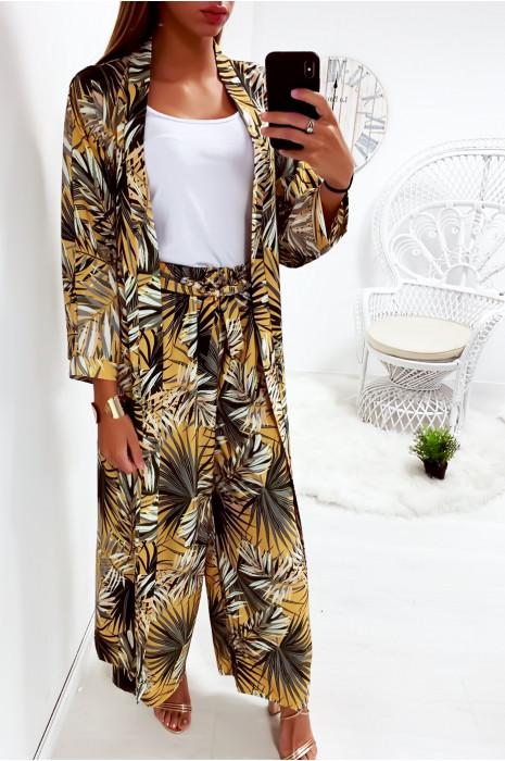 Ensemble kimono pantalon femme clearance, Jolie kimono long moutarde fleuri avec ceinture vendu sans pantalon clearance